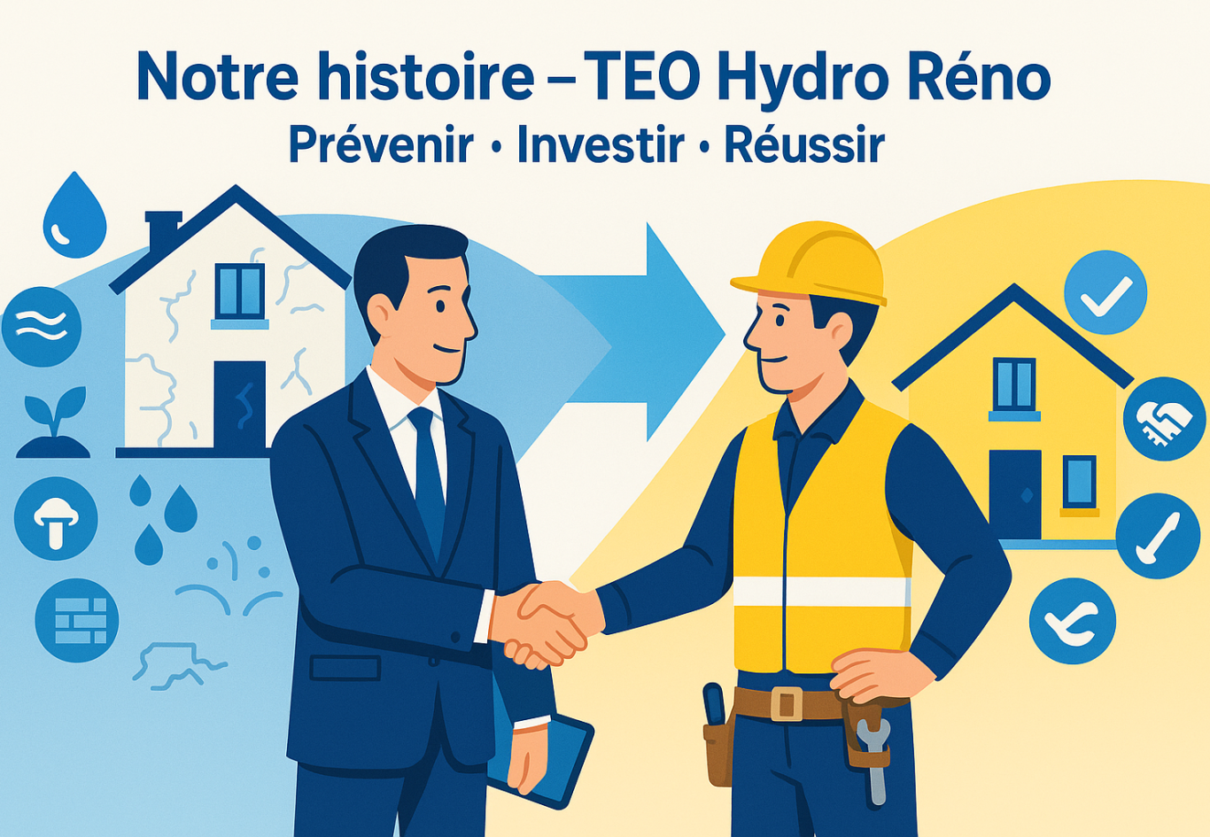 TEO Hydro : diagnostic humidité, drainage, traitements contre les remontées de nappe et la mérule, étanchéité en sous-œuvre, ventilation (VMI/VMC). TEO Réno : rénovation après sinistre, gros œuvre, second œuvre, interventions d’urgence pour sécuriser et remettre en état.