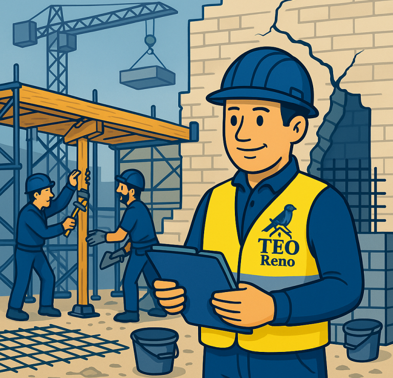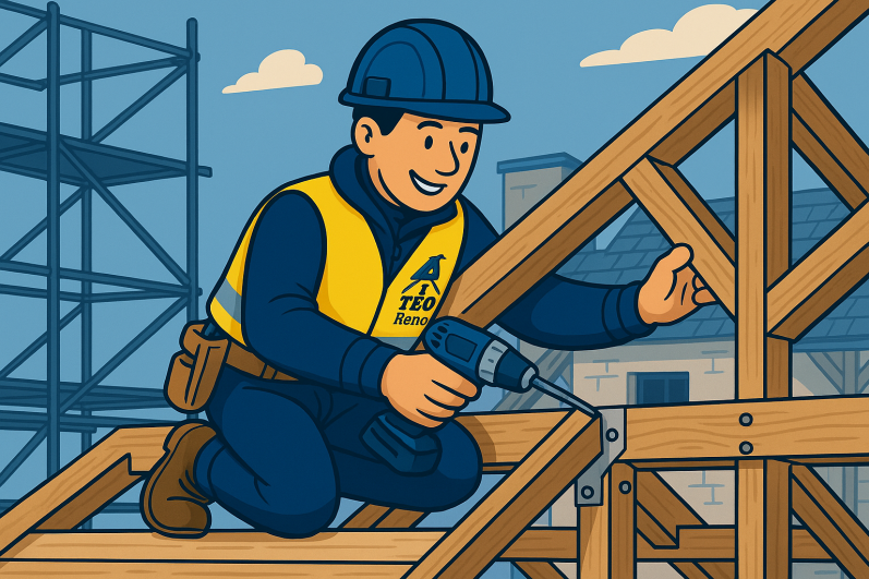 TEO Réno est spécialisé dans les travaux de gros œuvre, de structure bois et de renforcement technique, dans le cadre de rénovations complexes, de sinistres assurés, ou de transformations lourdes de bâtiment.