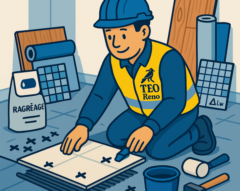 - Préparation : ragréage, chape fluide, sous-couches acoustiques