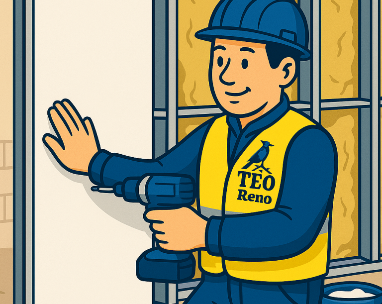 TEO Réno prend en charge l’ensemble des travaux de finition intérieure — cloisons, isolation, revêtements, menuiseries, équipements techniques — pour des projets de rénovation complète, de remise en état après sinistre